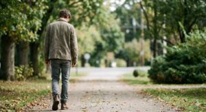 お題: 「さんぽしながら、少し考え事をしている人の様子」