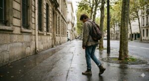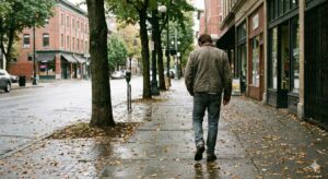 同じ生成ツールを使っているのに、人物にぐっと寄った構図になりやすい傾向がありました。表情は見えないものの、肩の落ち方や歩き方に「考え事」の深さが表現されているような、少し重厚な印象に変わりました。