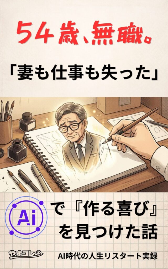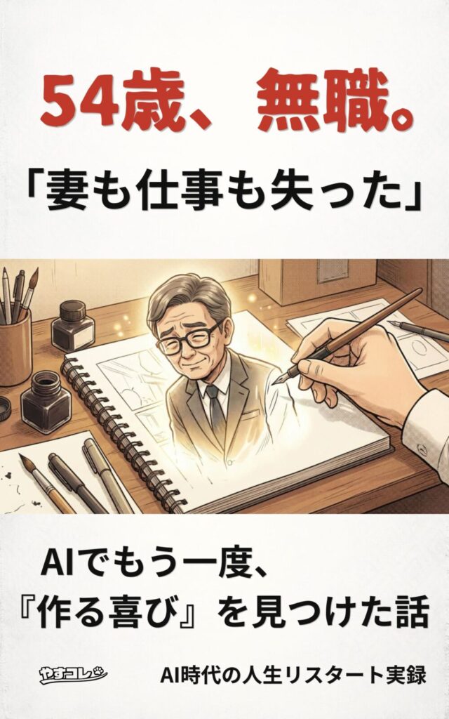 「54歳、無職」という私の生々しい経験を、どうすれば読者の心に届く一枚の画像にできるのか。 今回は、実際の表紙デザインの「ビフォー・アフター」を公開しながら、私がどうやって泥臭く「完成」まで辿り着いたのか、その舞台裏をお話しします。