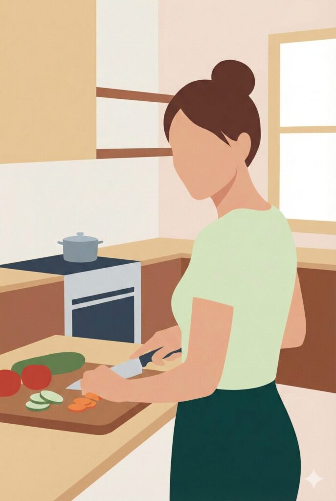 - 共通のお題: 「家の中のキッチンで、女性が料理をしている様子」